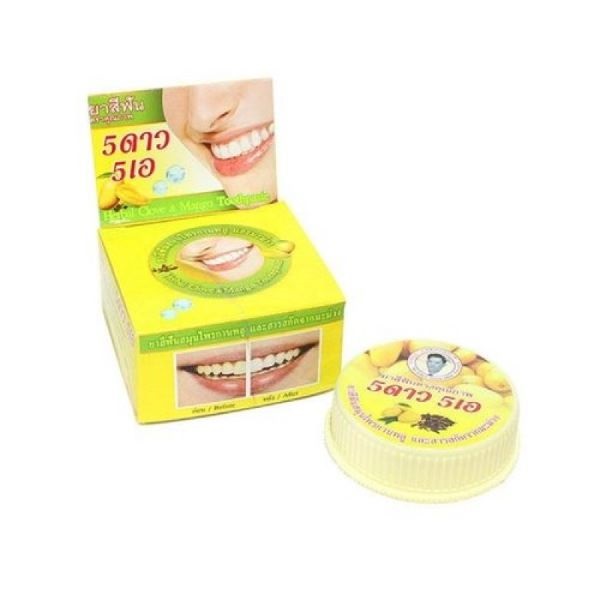 Тайская отбеливающая зубная паста на травах с экстрактом Манго, хорошо чистит зубы и десны, благодаря специальному составу и наличию в нем множества активных веществ, препятствует образованию зубного камня, удаляет темный налет на зубах от кофе, чая и табака. Хорошо освежает полость рта. Дыхание становится свежим. Не стирает зубную эмаль. Предотвращает размножение бактерий в полости рта.
